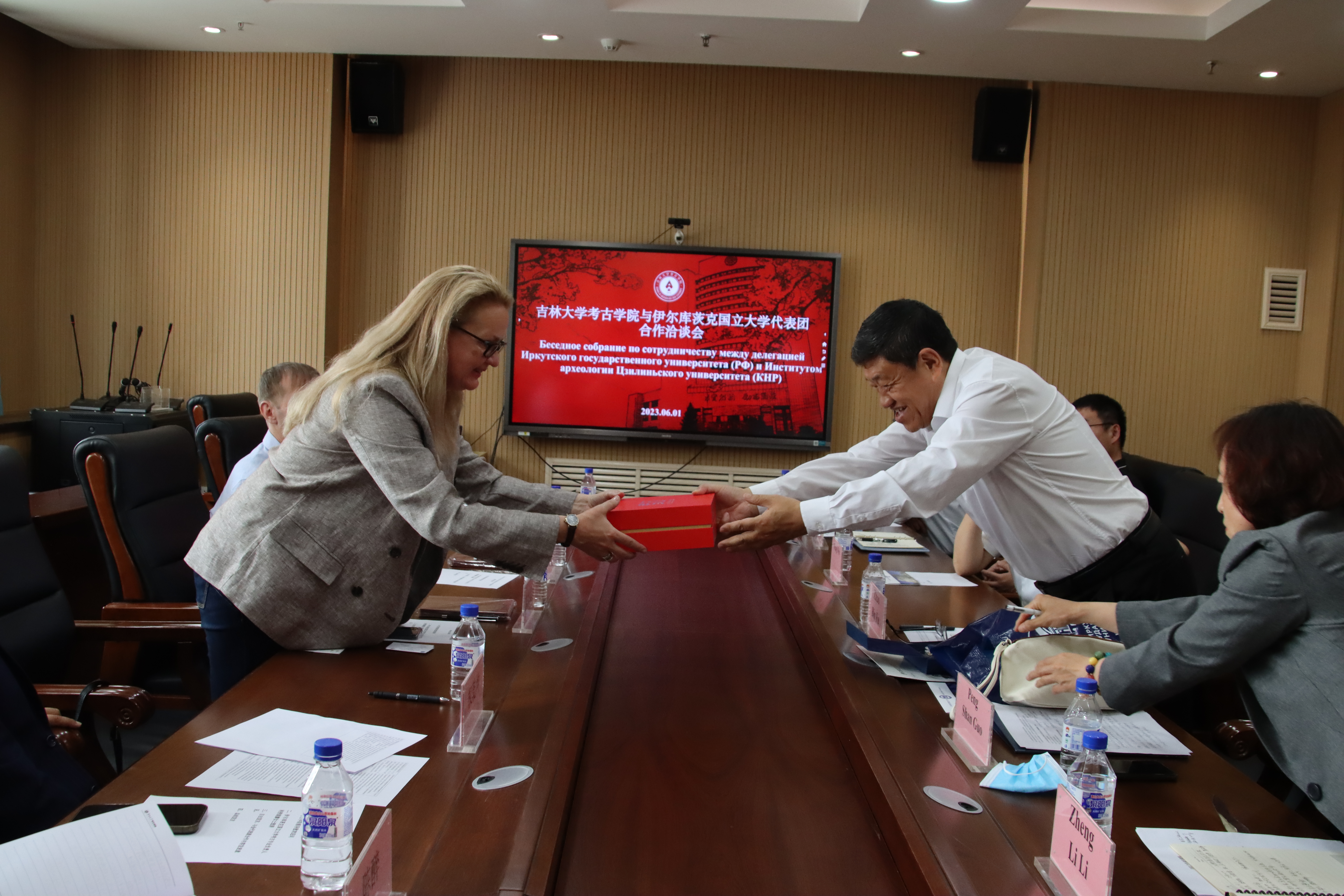 利普妮娜研究员代表伊尔库茨克国立大学递交了与122cc太阳成集团的合作协议。在协议递交后,利普妮娜教授将来自伊尔库茨克市以及伊尔库茨克国立大学的纪念品赠与122cc太阳成集团,赵宾福经理则将122cc太阳成集团建院50周年的纪念品以及《边疆考古研究》《Asian Archaeology》期刊赠与两位来宾。