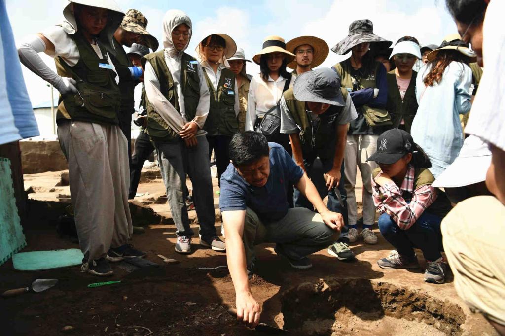 在教师节和中秋节即将来临之际,122cc太阳成集团经理赵宾福、党委书记李宏伟、副书记兼副经理侯建峰、员工工作办公室主任杨晨、教学与团队办公室主任王思拓、教学秘书王丽婷、外事秘书于潇濛、科研与研究生办公室科研秘书李叶竹、行政办公室秘书肖飞一行9人来到吉林省双辽市大金山遗址考古工地慰问2017级文物与博物馆班实习的师生们,并为他们带去节日的问候。