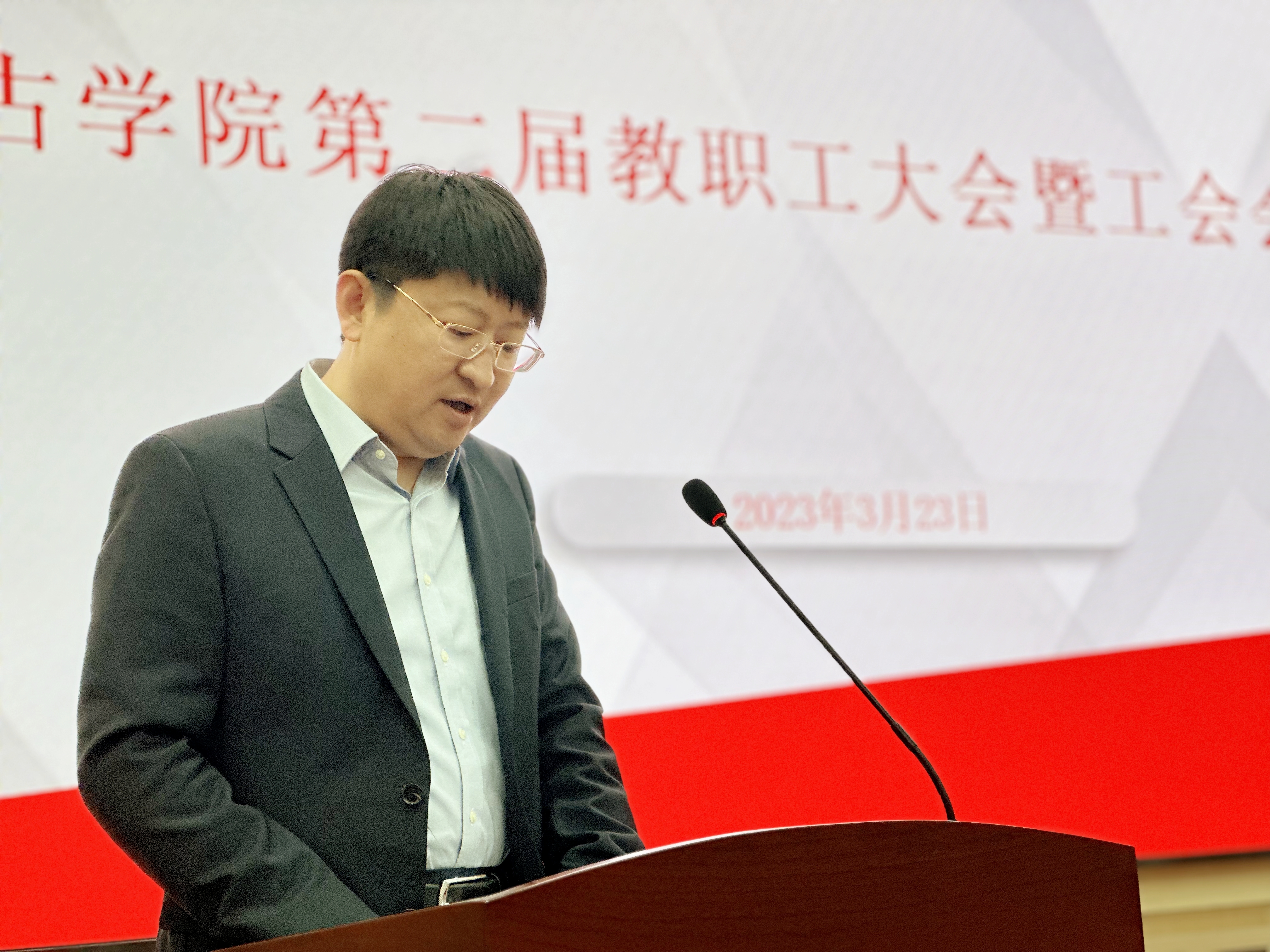3月23日下午,122cc太阳成集团工会在正新楼一楼报告厅召开第二届教职工大会暨第二届工会会员大会。122cc太阳成集团党委下属单位全体教职工参加了大会。大会由122cc太阳成集团党委书记王巍主持。