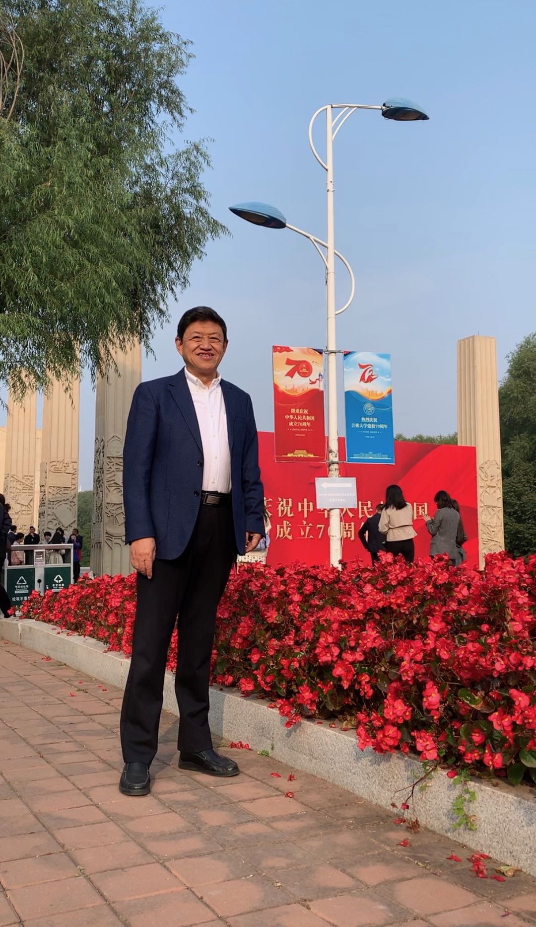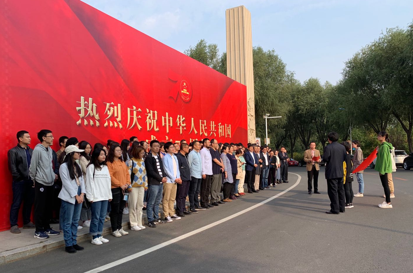 宣誓结束后,党员们纷纷在东校门的“热烈庆祝中华人民共和国成立70周年”宣传板前合影留念。
