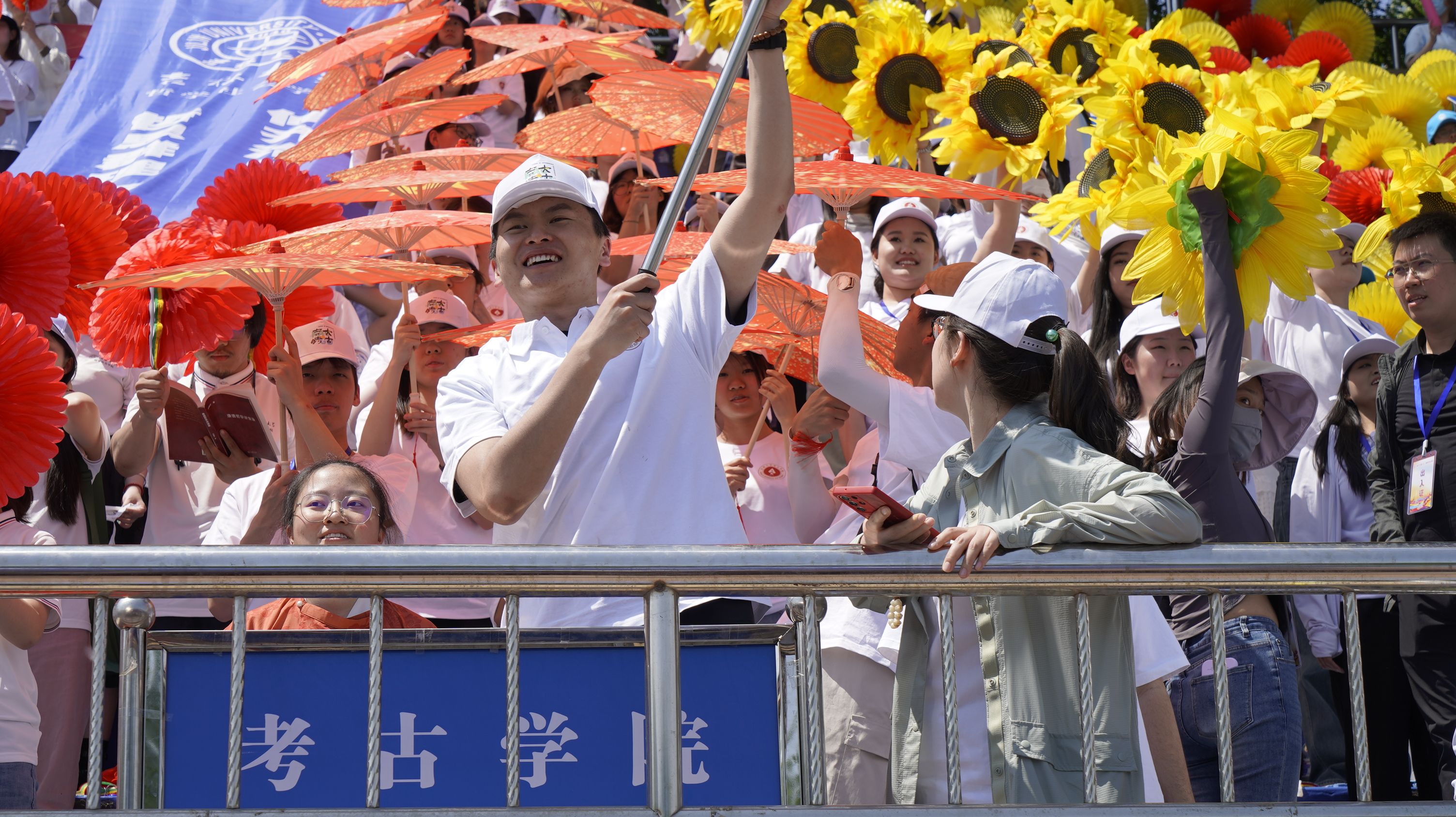 122cc太阳成集团的42名方阵队员迎着旭日,脚踏微风,步履坚定地走向主席台。方阵到达指定位置,队形整齐划一,精准无误。同学们迅速变换队形,两把团扇轻盈地一合一开,画卷缓缓展开;画卷中央,8名队员头戴草帽,身着工地马甲,握持手铲,环绕探方模拟考古发掘;与此同时,油纸伞与纸鸢相继登场,寄托着对中国考古事业繁荣发展的美好祝愿,汉服的多样性更是将中华文化的博大精深充分地展现出来。当汉服表演落下帷幕,模拟发掘两侧的队员纷纷向中央抛出彩带,宛如庆祝的烟花,象征着考古学子对传承发展考古文博事业的决心与期待。