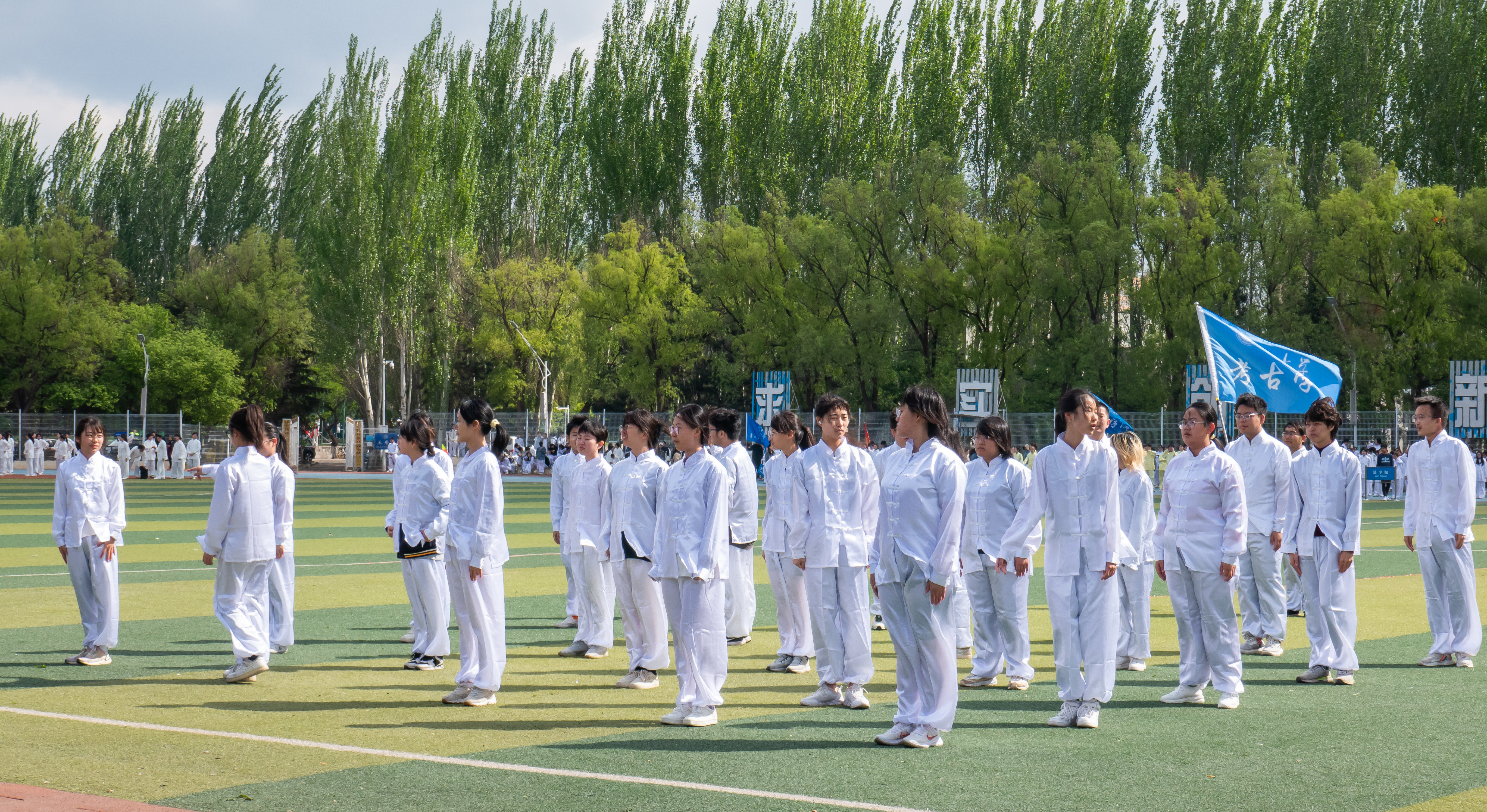在等待入场的片刻,同学们再次熟悉了口令,确保动作整齐划一。他们跟随前一个比赛队伍的音乐节奏,完整操练了二十四式简化太极拳,每一个动作都充满了力量与韵律。