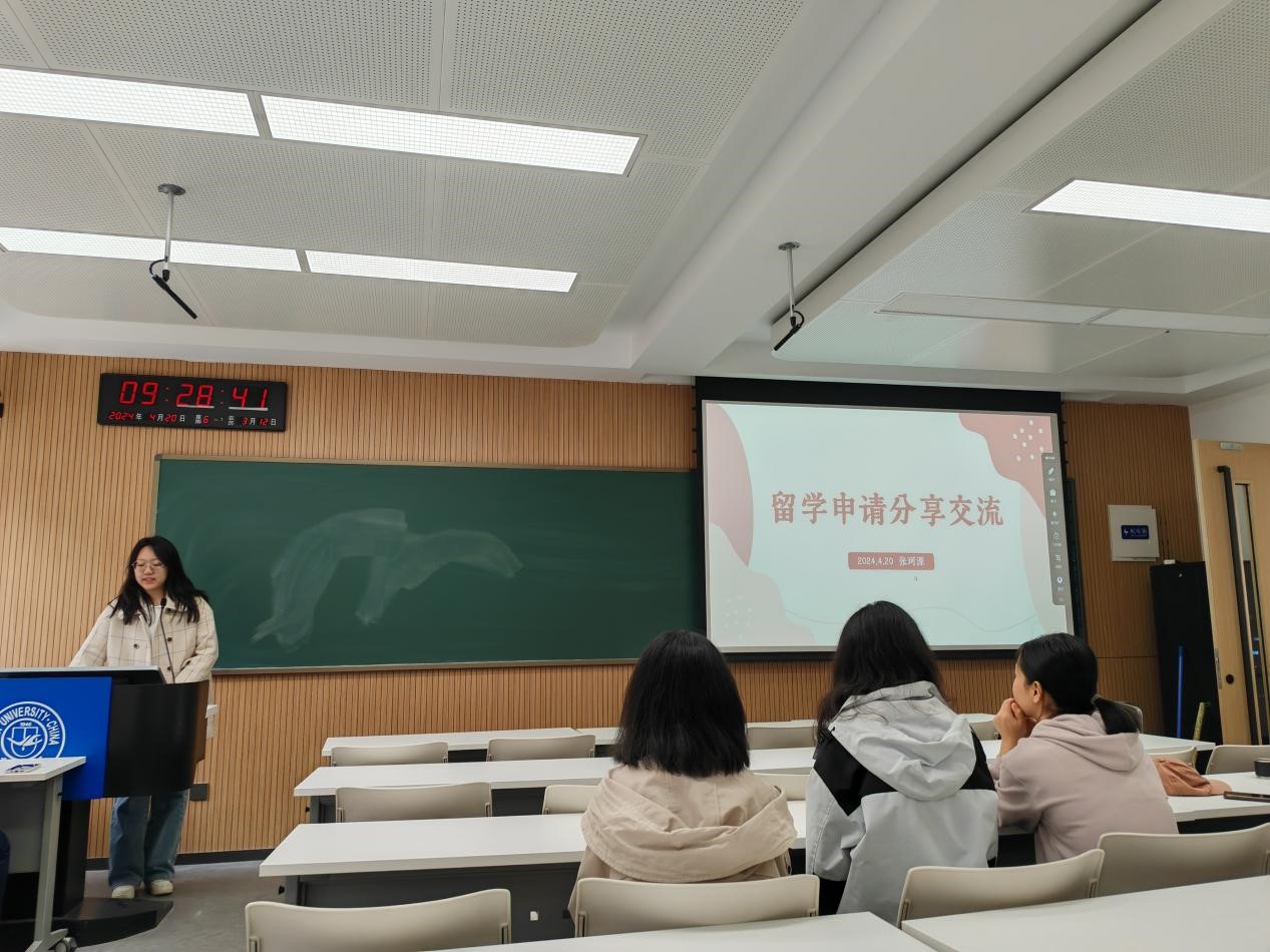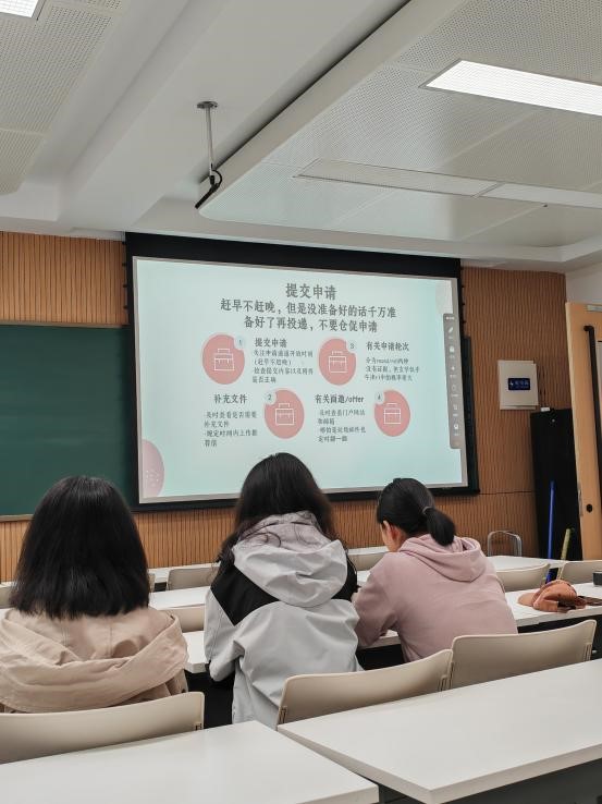 张珂源分享了英国留学申请经验,包括院校选择、申请时段、信息来源、文书准备以及沟通导师五个方面。她指出与导师提前沟通的重要性,并详细介绍了准备几种文书时的注意事项,让同学们对英国留学申请流程有了更全面的了解。