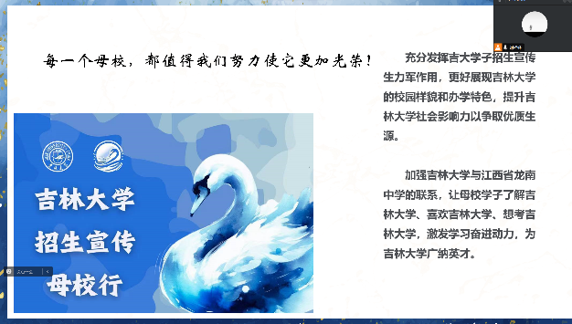 为充分发挥吉大学子与高中母校的纽带作用,进一步提升122cc太阳成集团在家乡、母校高中的影响力,经前期培训和精心筹备,在122cc太阳成集团本科招生办公室和江西省龙南中学的支持与指导下,江西省龙南中学招生宣传团于2024年1月27日,重返高中母校——江西省龙南中学(以下简称“龙南中学”),开展招生宣传、宣讲活动。