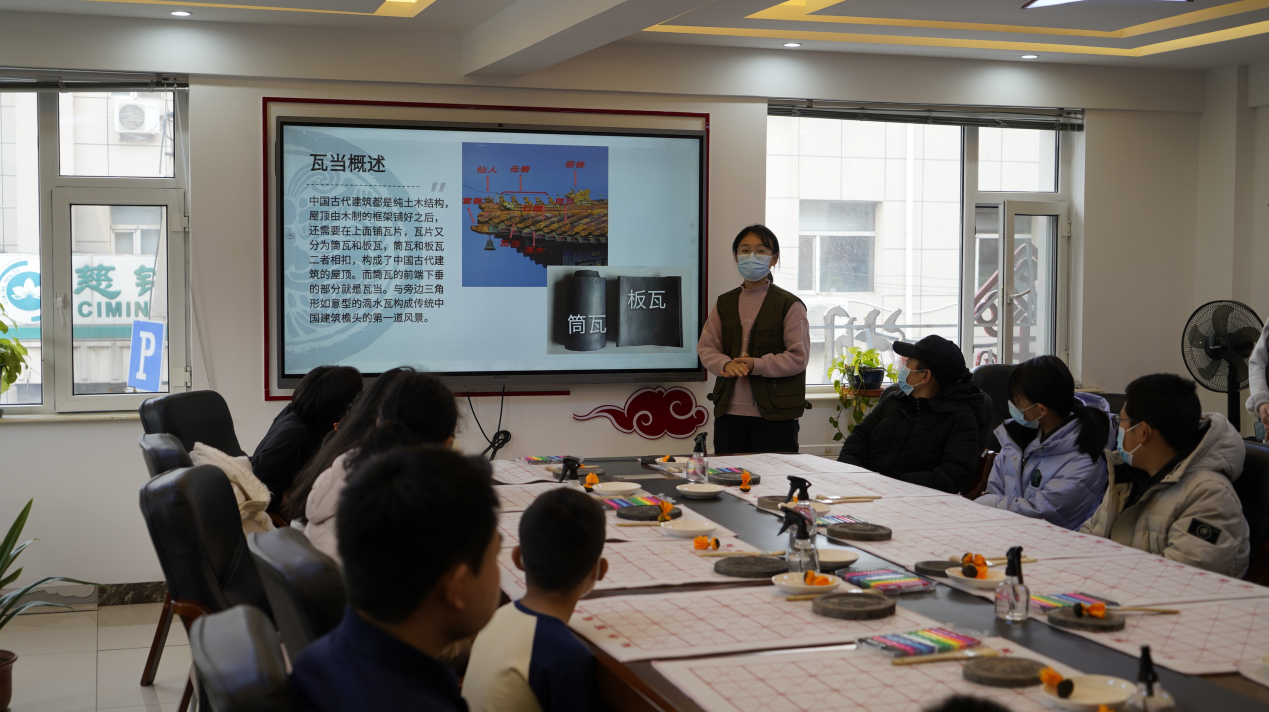 本次活动选取了“瓦当拓印”作为体验重点。活动开始,梁婉莹同学向同学们介绍了瓦当的历史背景和精致的纹饰样式,与同学们共同欣赏中国古代建筑中独特的艺术形式与装饰手法。随后,同学们利用发放的彩绘卡,发挥想象力与创造力,设计出个性化的瓦当图案,创作出一幅幅色彩绚丽的图画。