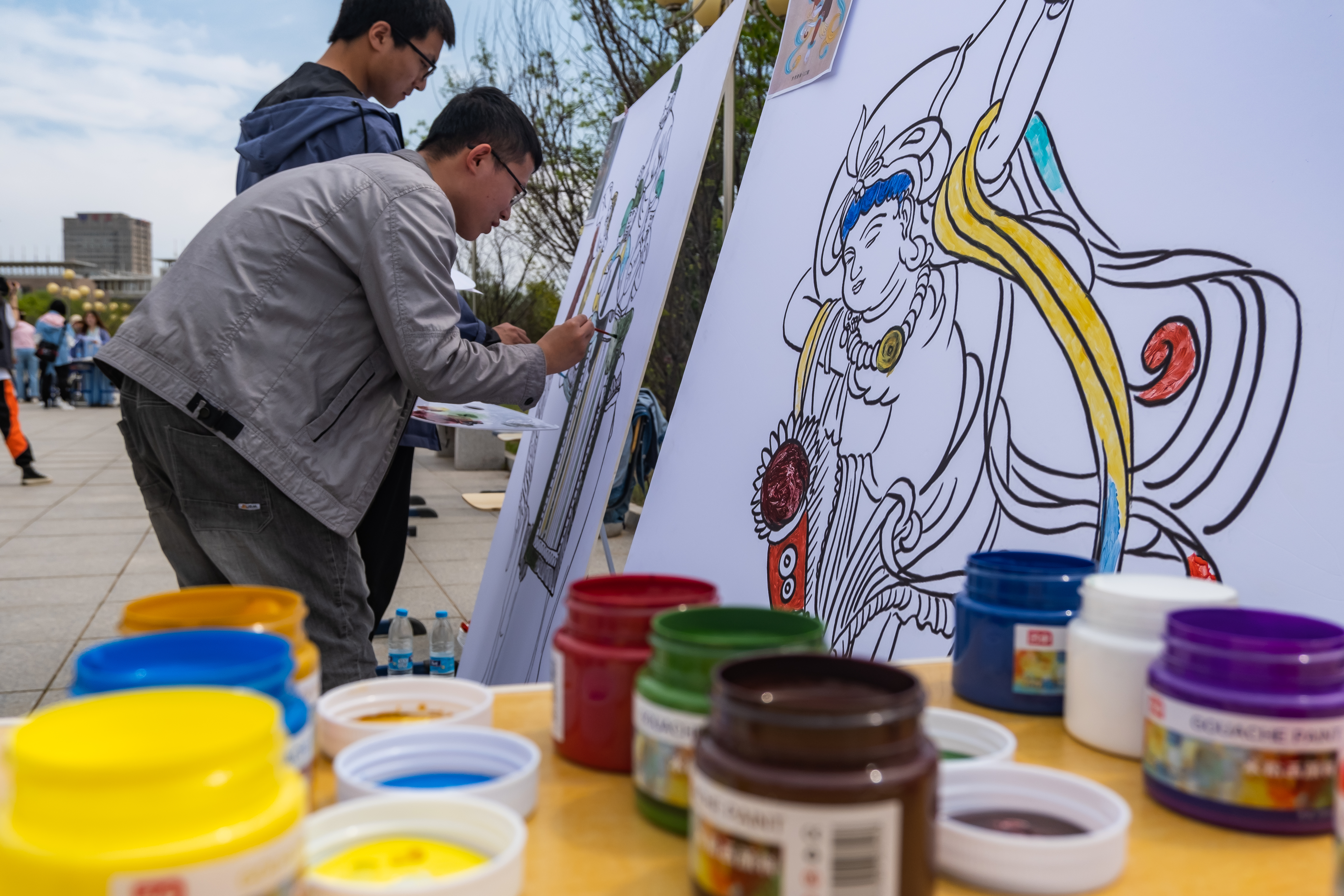 用颜料浸润古今,以丰富的色彩勾描历史画像。画笔多样,画手相异,画下的填色亦是百态层生,或沿着文物既定的形制和色彩,或倾泻天马行空的奇思与妙想,留下一个个斑斓的美学形象。在细细刻画唐三彩与飞天的迷人与优雅之外,参与者的作品也未拘束在线条的框架中,在空白处以彩色留下今日与考古的相遇,绽放春日的奇迹。