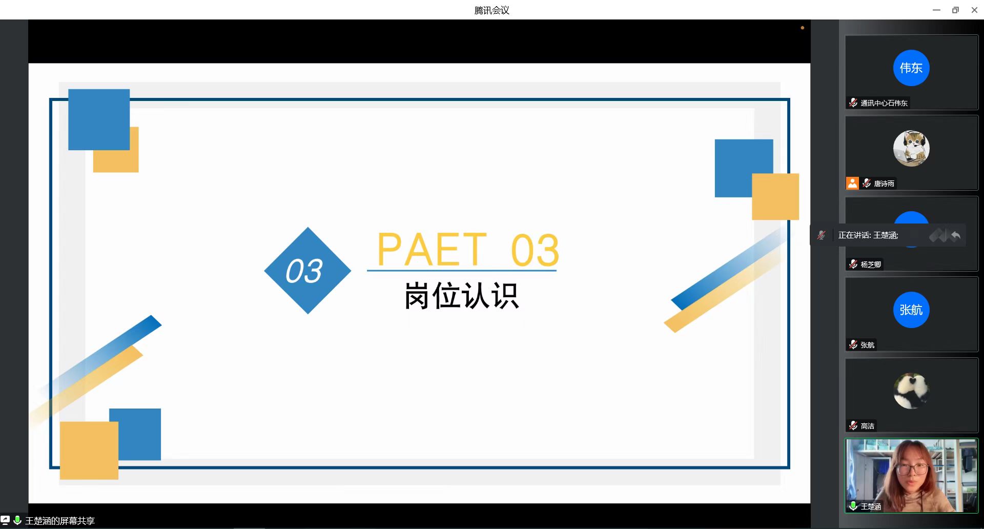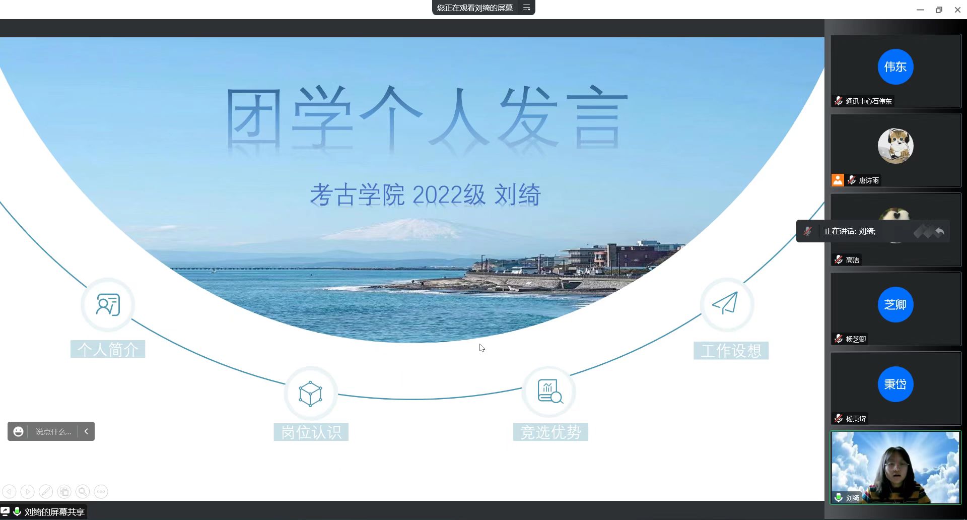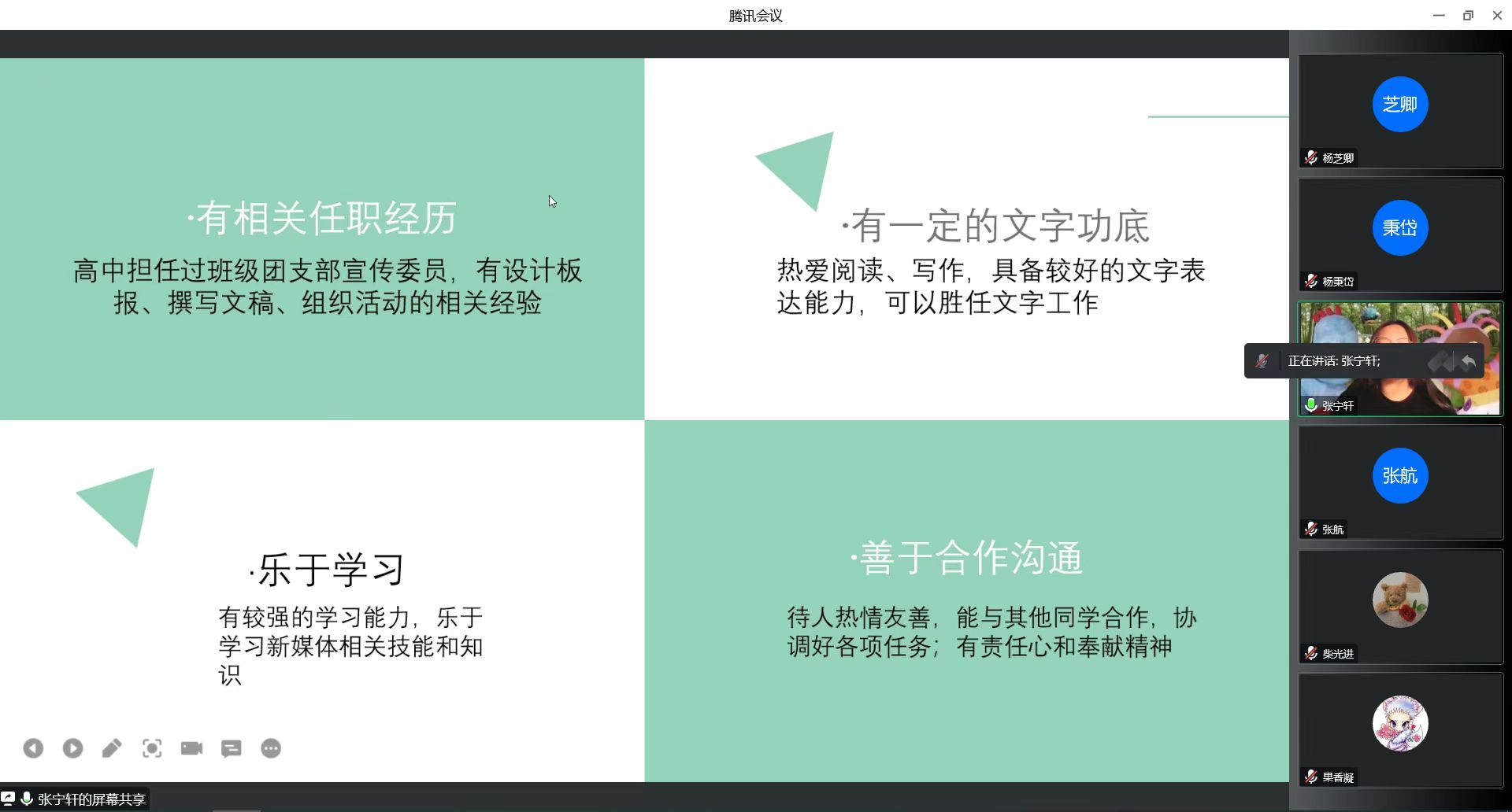 根据当前公司的相关防疫政策,本次纳新面试通过腾讯会议于线上举行 。为保障纳新过程顺利进行,团学组织相关负责人针对本年度报名情况制定出合理的考核方式和考核标准,向各纳新部门征集面试问题,并召开线上会议进行面试官培训。上午9时,参与面试的同学按照编号顺序,依次进入等候室和会议室进行面试。本次面试分为自我介绍和个人答辩两个环节。参加的同学首先通过PPT等形式,分别从个人简介、岗位认识、竞选优势、工作设想等方面进行时长三分钟的竞选演讲。在此环节中,每位同学都充分展示了自己在性格、能力、工作经验等方面的竞选优势,不吝表达了对所报名的职务的工作任务的设想与规划,尽显为公司奉献、为同学服务的决心和对后续工作的展望。在随后的个人答辩环节,面试官结合同学们的自我陈述内容和竞选岗位的工作内容及特点,向同学们有针对性地提出了一些问题,引导同学们重新思考工作与学习的关系、协同工作的意义等关键问题。通过时长一分钟的答辩,面试官进一步加深了对竞选者的了解,同学们也对团学组织有了更深刻的认识。整个面试流程中,应试同学和面试官紧密配合,每位同学之间衔接有序,共同取得了良好效果。中午12时30分,纳新面试圆满结束。