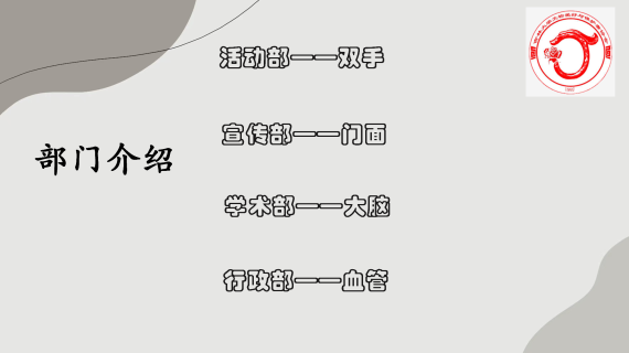 接着,由活动部刘彦辰同学、宣传部郭文卓同学、学术部周雪淳同学及行政部宋妤僖同学详细介绍部门职能和工作需求。文保协会下设四个部门,分别是活动部、宣传部、行政部和学术部,各部门各司其职又互相合作,协作举办一系列高质量的活动。各位负责人讲解有趣,收到热烈反响。
