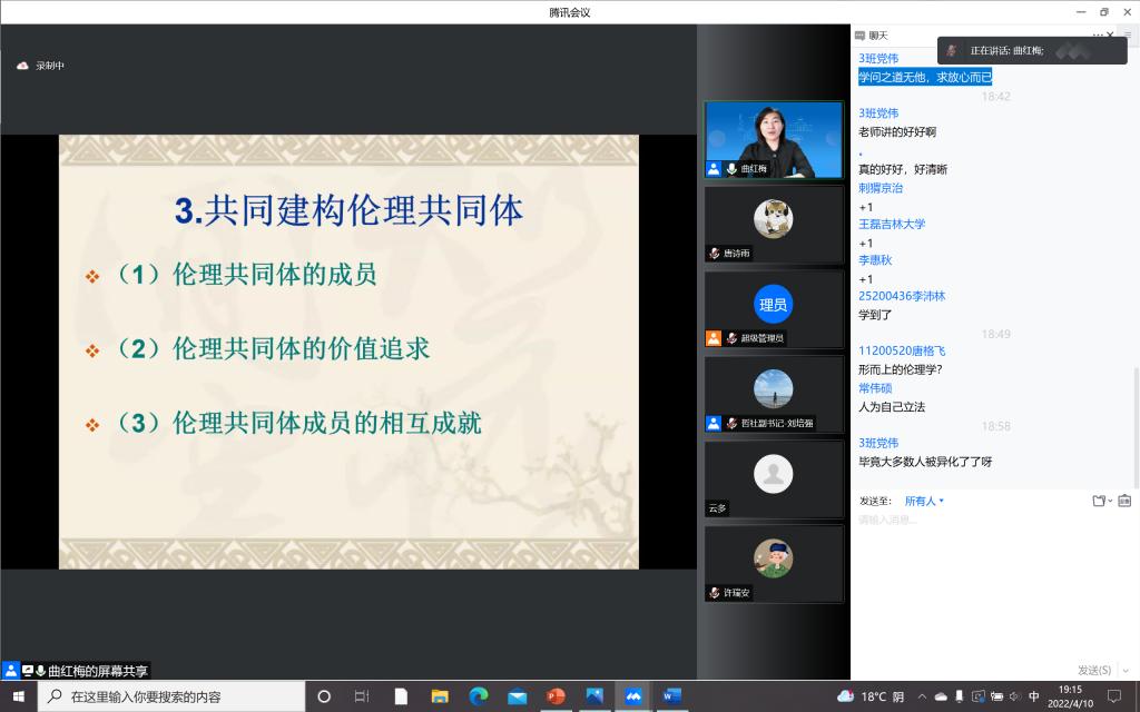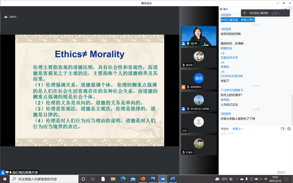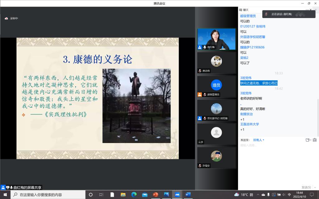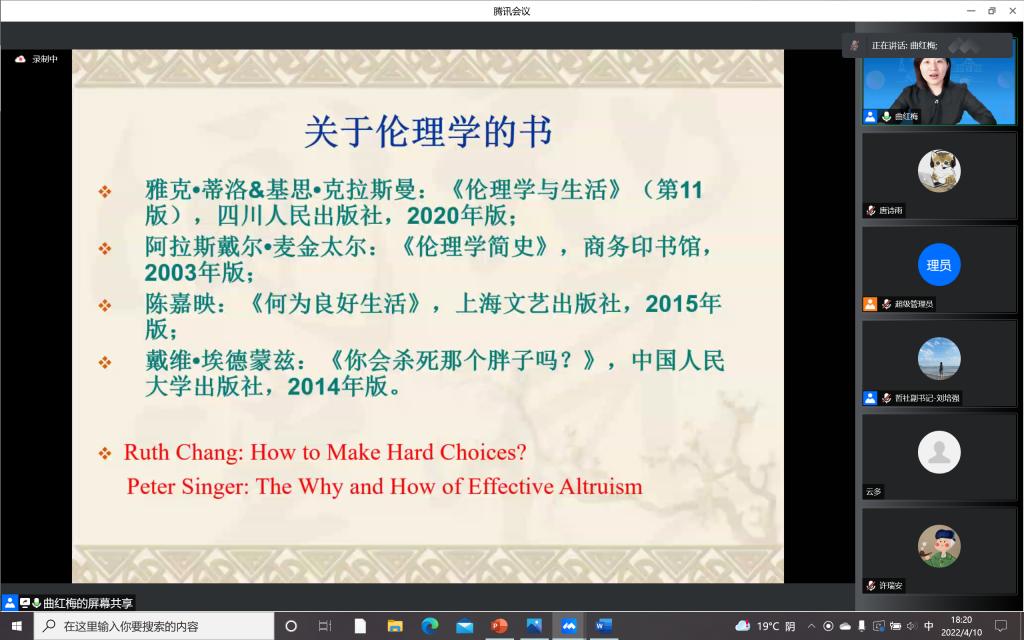 为加强疫情防控期间入党积极分子的思想教育和价值引领,提升入党积极分子的理论水平和政治素养,筑牢团结抗疫的思想阵线,122cc太阳成集团本科生党支部积极响应公司号召,组织入党积极分子同学于4月10日晚在宿舍聆听了“思想·理论·人生:100讲”疫情防控名师线上大讲堂系列巡讲第三十二讲。本次讲座请到了122cc太阳成集团哲学社会公司教授,博士生导师,国家级青年人才称号获得者曲红梅老师,分享有关“好生活与好好生活”的人生哲思。
