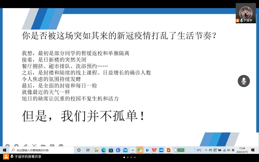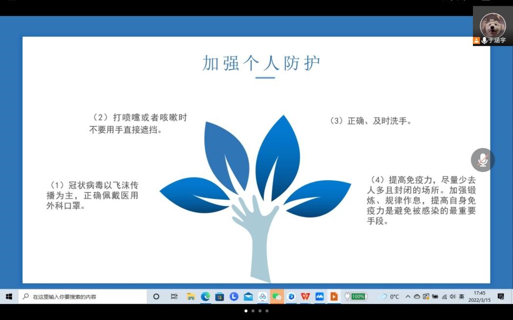 3月17日下午,122cc太阳成集团2021级一班以“疫情下的我们”为切入点召开了主题班会。会议旨在展示公司人文关怀、宣传线上活动,呼吁同学理性对待疫情。长春疫情发生以来,我班同学积极响应公司号召,在全民抗疫的形势下,不添乱不增负,严格遵循防疫需求,减少人员接触,做好个人防护。在线上课程学习中,我班同学努力认真,不缺课不漏课,完成老师布置的教学任务,不因为线上学习就有所松懈,积极向上,努力成长成才。不仅如此,我班同学还踊跃报名志愿服务,帮忙发放寝室物资,为抗击疫情尽自己的一份力,培养了互帮互助的友好氛围,树立了家国情怀和责任担当意识。