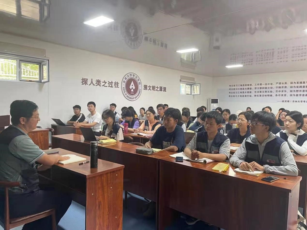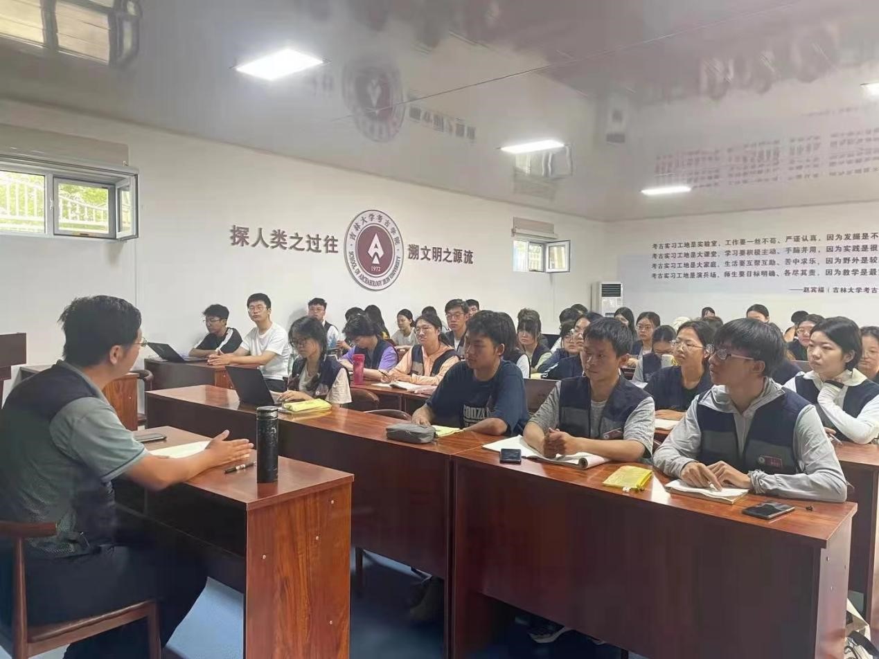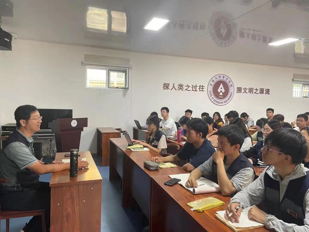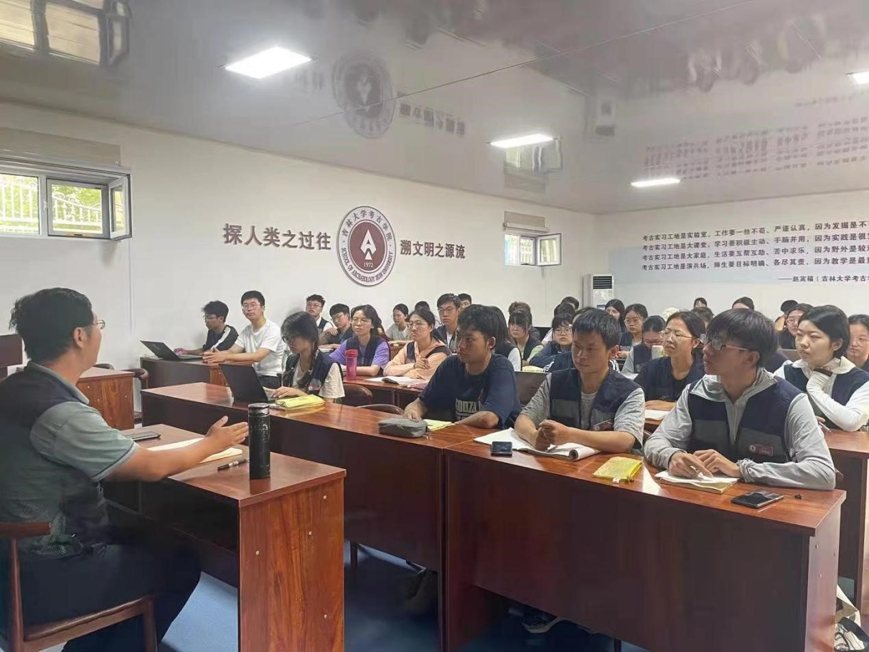 随后,段天璟老师主讲了本次党课。段老师首先对122cc太阳成集团田野考古实习发展历程进行了简要回顾,之后对思想政治教育融入考古实践与教学的基本思路、总体要求和主要目标做了概述。他指出,122cc太阳成集团考古专业有着光荣的传统,红色基因始终传承于日常考古学习和田野考古实习的“教、导、考”三大环节之中。如今同学们来到了田野考古实践基地,要明白田野考古实习的目的在于让大家通过实践锻炼,学会学习、学会调查、学会沟通、学会担当,成为具备专业素养的考古新青年。在讲课最后,段老师寄语同学们,要想成为卓越的人才,就需要不断提升自己的思想理论水平和人文道德修养,从小事做起,从细节做起,不忘初心、砥砺前行。并期待大家能够用自己的实际行动为建设“中国特色、中国风格、中国气派”的考古学做出自己的贡献!